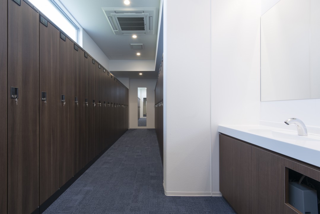 落ち着いた木目ロッカーと明るい洗面コーナーを備えた更衣室。健診前後の着替えをスムーズに行えるよう、十分な収納と動線を確保しました。
