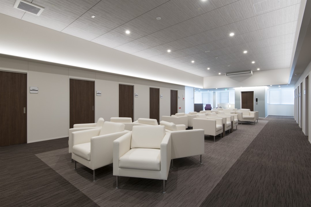ソファを広く配置した開放的な待合ロビー。上質な内装と柔らかな照明が、落ち着いた雰囲気を演出します。
