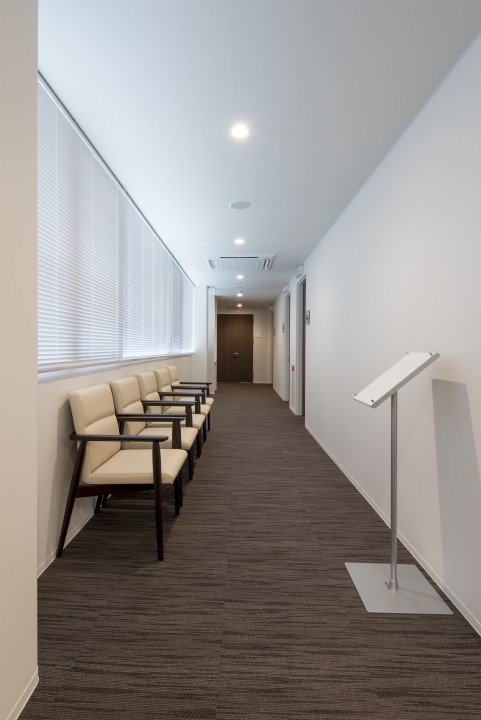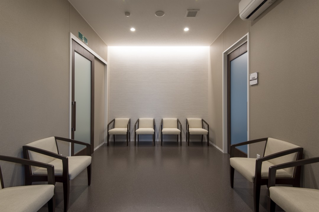 診察室へつながる動線上に設けた中待合。シンプルで落ち着いた家具を配置し、安心して順番を待てる環境を整えています。