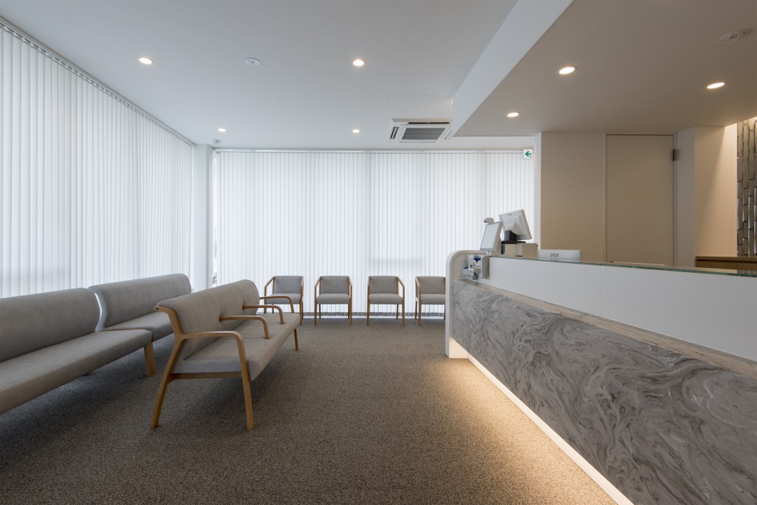 自然光がやさしく差し込む待合室。ゆったりとした配置のベンチソファにより、来院される方がリラックスして過ごせる空間を目指しました。