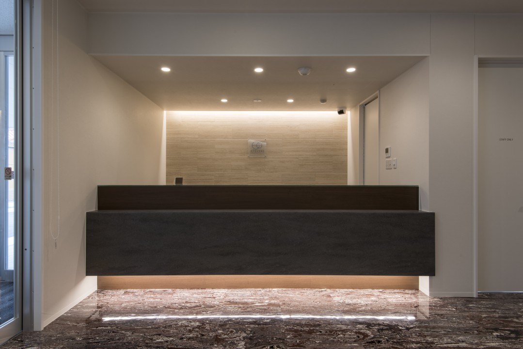 重厚感のある素材を活かしたカウンターが特徴。健診を受ける方を安心してお迎えできるよう、落ち着いた色調で仕上げました。