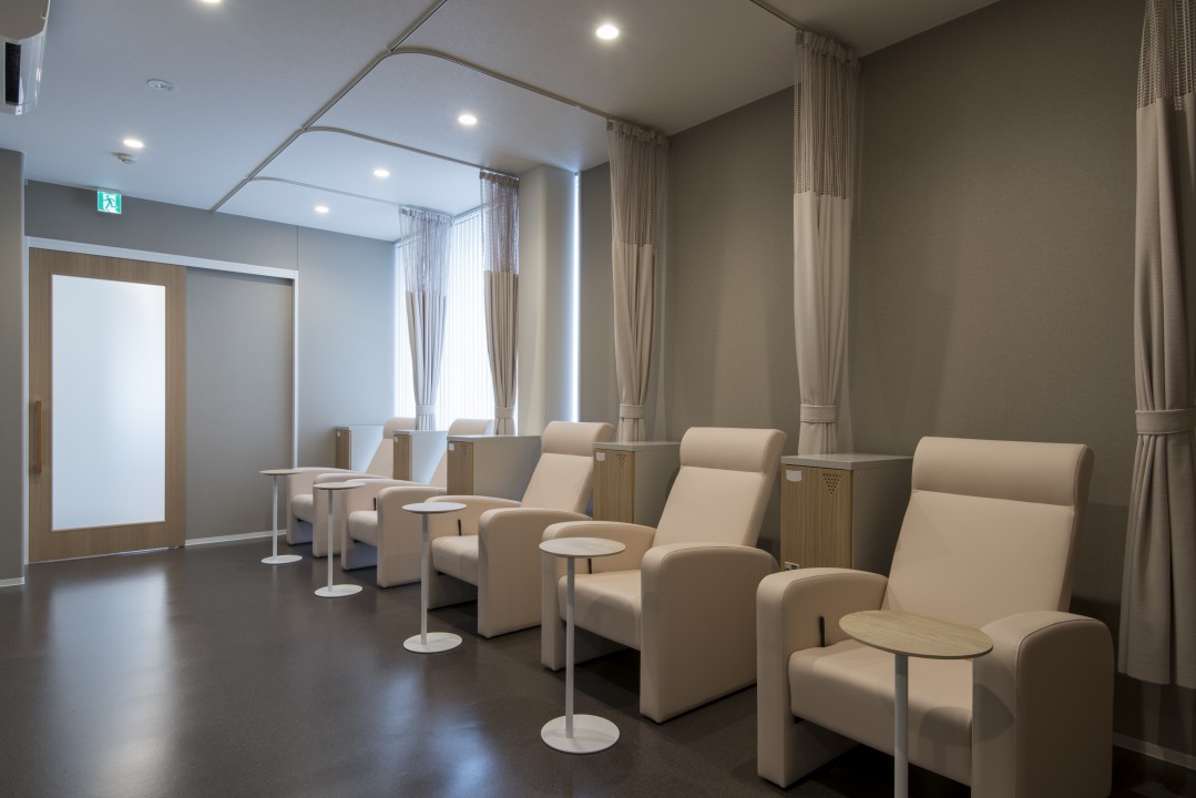 プライバシーに配慮した半個室スタイルのリクライニングチェアを採用。検査前後の時間を落ち着いて過ごせる、静かで快適なラウンジです。