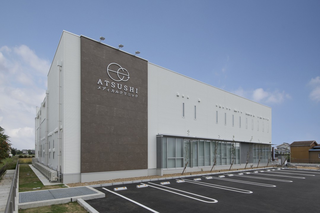 白を基調とした清潔感ある外観に、ブラウンのアクセントウォールを組み合わせた現代的なデザイン。大きな窓面が明るく開放的な印象を与えます。