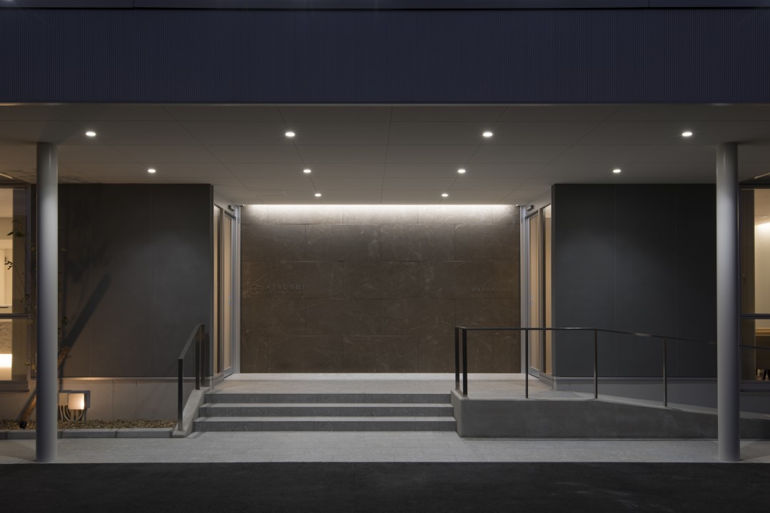 間接照明が印象的なエントランス。来院者をやさしく迎える、上質で落ち着いたアプローチ空間です。